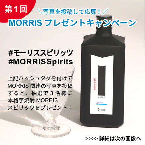 CHIE IMAIプロデュース 本格芋焼酎MORRIS(モーリス)スピリッツを楽しむ様子を写真に撮って、対象ハッシュタグを付けて投稿するだけで応募完了!